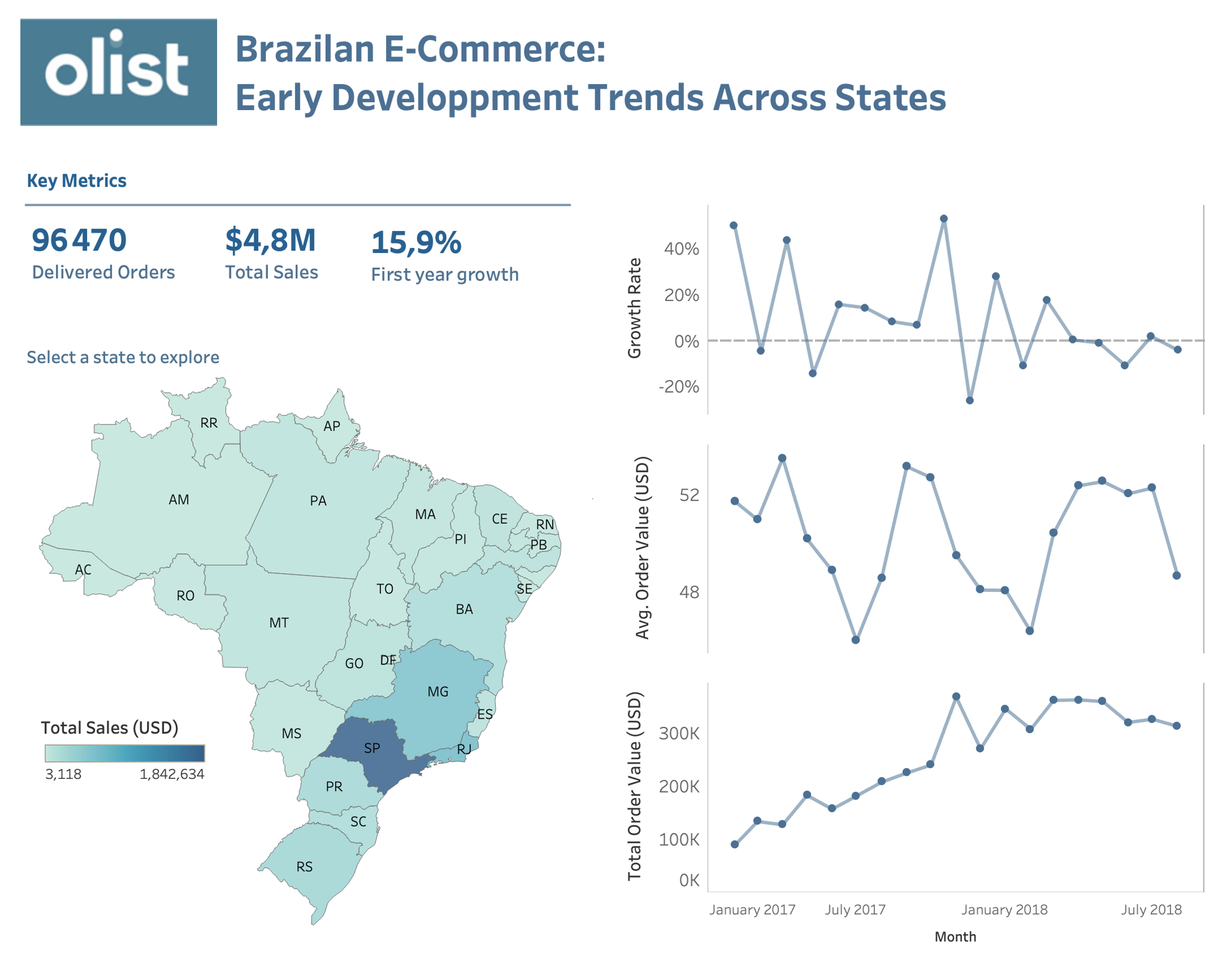 Figure 2. Dashboard showing the monthly growth rate, average order value, and total sales, and its variation across states. Open in Tableau Public to explore the data interactively.