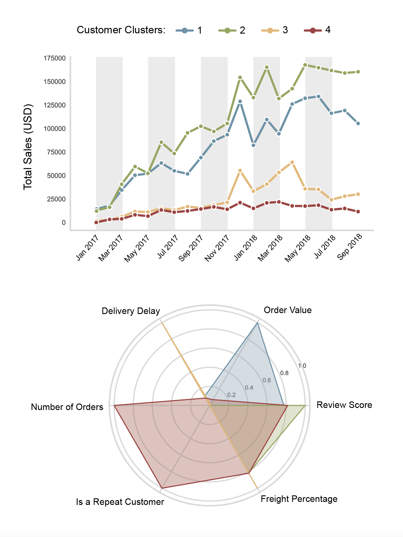 Figure 3. Top: Monthly sales by customer cluster during the 2017–2018 period. Bottom: Radar chart illustrating the key behavioral and value attributes of each cluster.